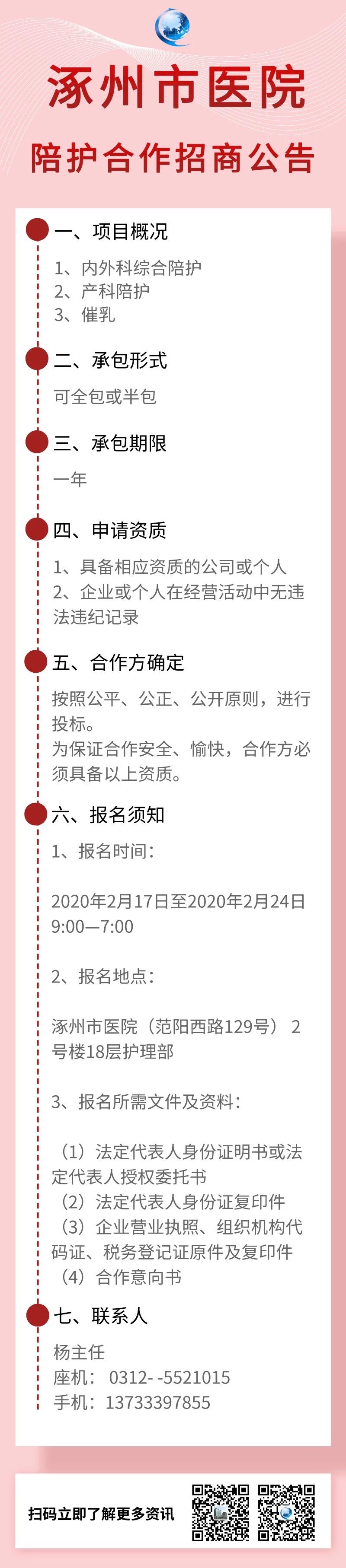 因我院规模不断扩大,患者人数逐年上增,为了更好的管理陪护人员,保证患者安全,经院领导研究决定,特面向社会招聘合作伙伴,共同管理医院陪护人员和发展产科业务。现将有关事宜公告如下。