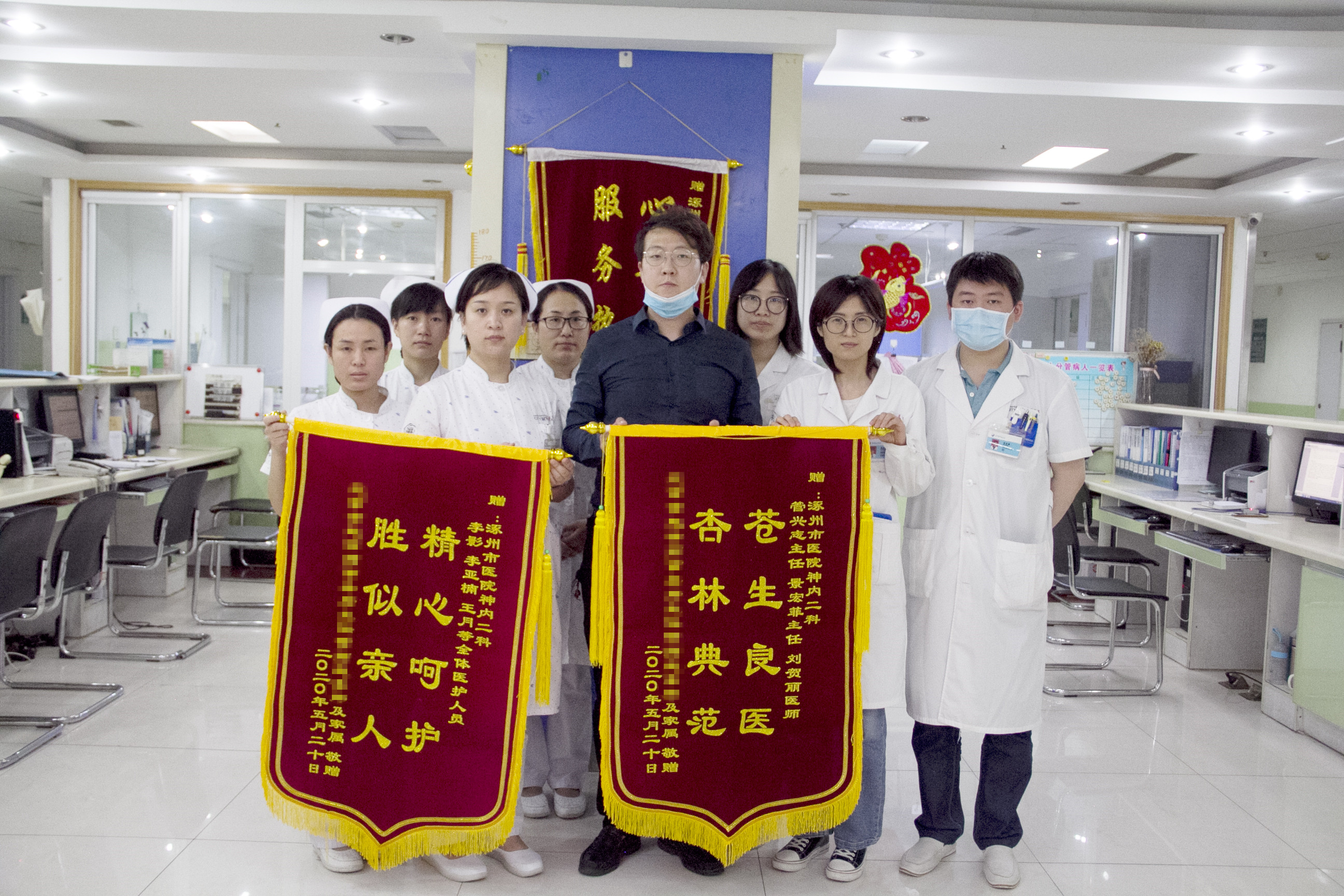 近日,患者赵先生的家属将印有“苍生良医,杏林典范”“精心呵护,胜似亲人”的两面锦旗,送到了涿州市医院神经内科二病区医护人员手中,并再次感谢科室全体医护人员对赵先生住院期间的精心治疗和贴心照顾。