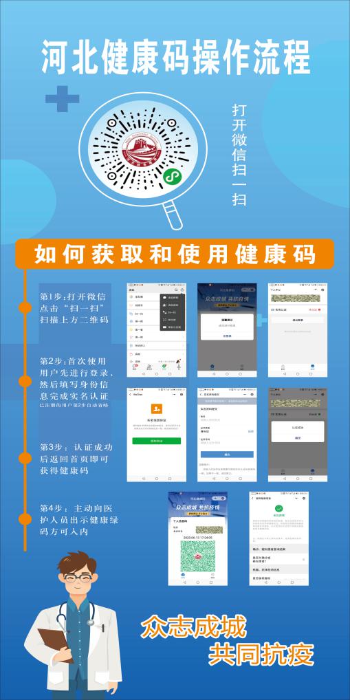 1、打开微信“扫一扫”扫描下方“二维码” 2、首次使用用户先进行登录然后填写身份信息完成实名认证(已注册的用户第二步自动忽略) 3、认证成功后返回首页即可获得健康码 4、主动向医护人员出示健康绿码方可入内
