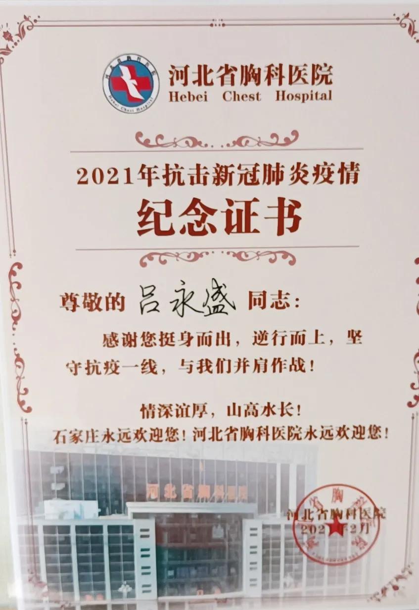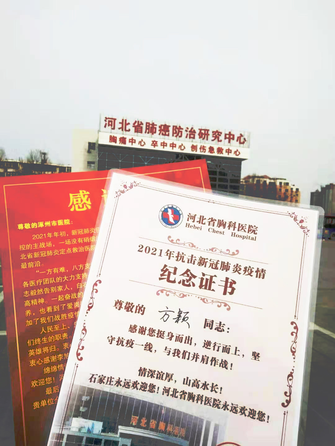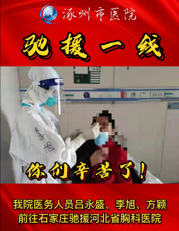 2021年初,新冠疫情突袭石家庄。医院根据上级部门工作要求,迅速组建新一批医疗队协助河北省胸科医院开展新冠肺炎患者救治工作,1月11日,由吕永盛、李旭、方颖组建的医疗队完成集结,带着院领导及全院职工的支持与关怀,奔赴疫情防控斗争第一线。