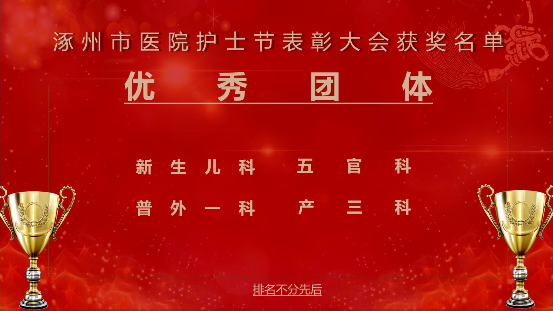 2020年度优秀团体奖的获奖单位,是根据医院岗位大练兵科室的总成绩,选出分数排名前四位的科室,结合科室的日常表现评选出的。它们分别是: