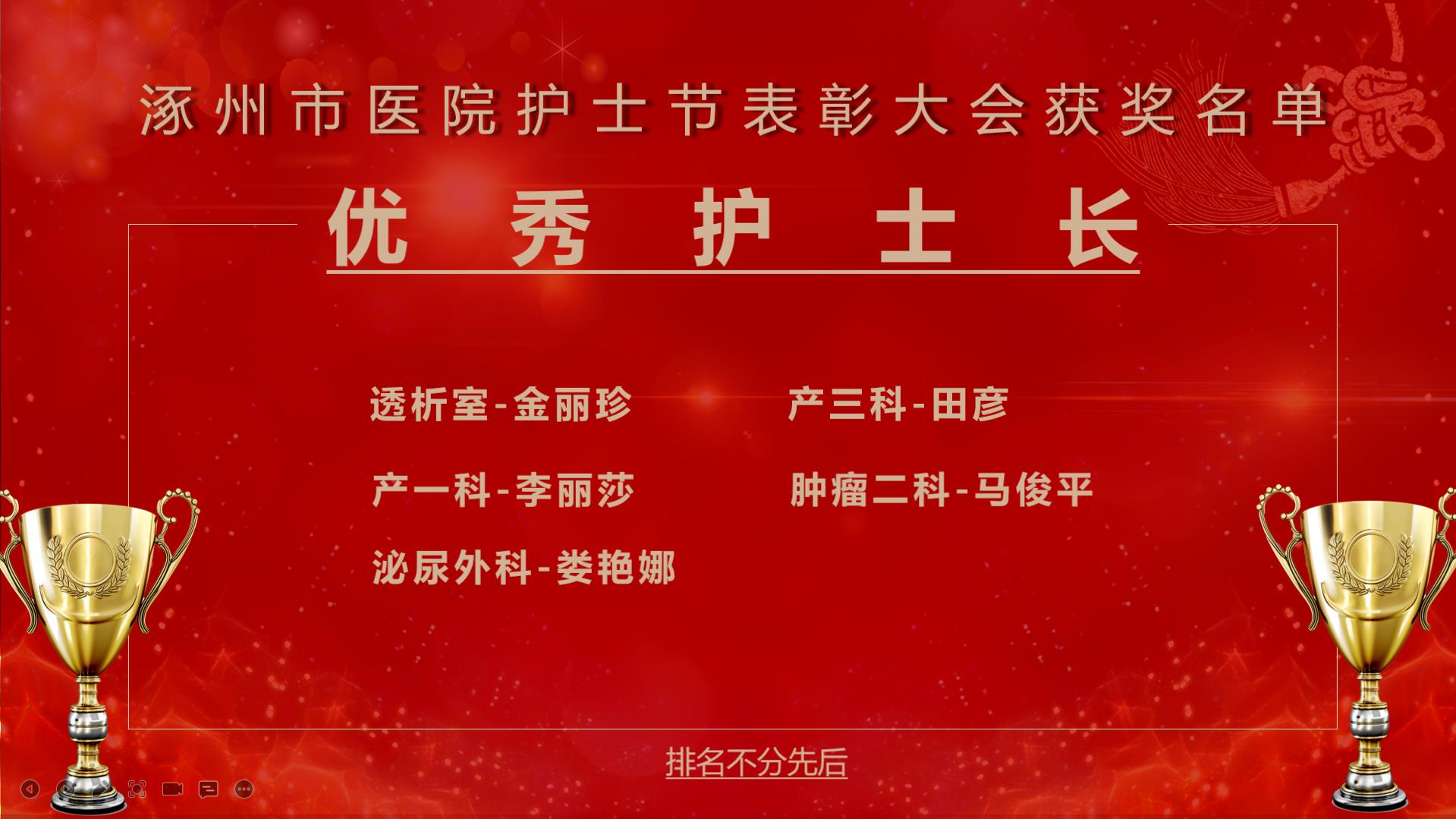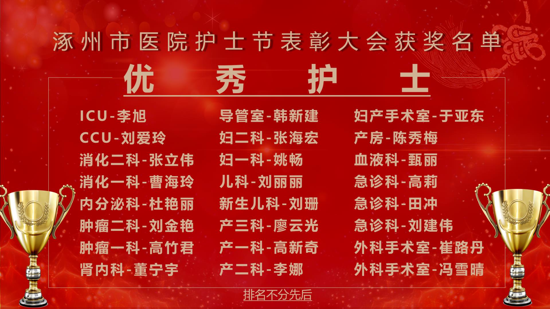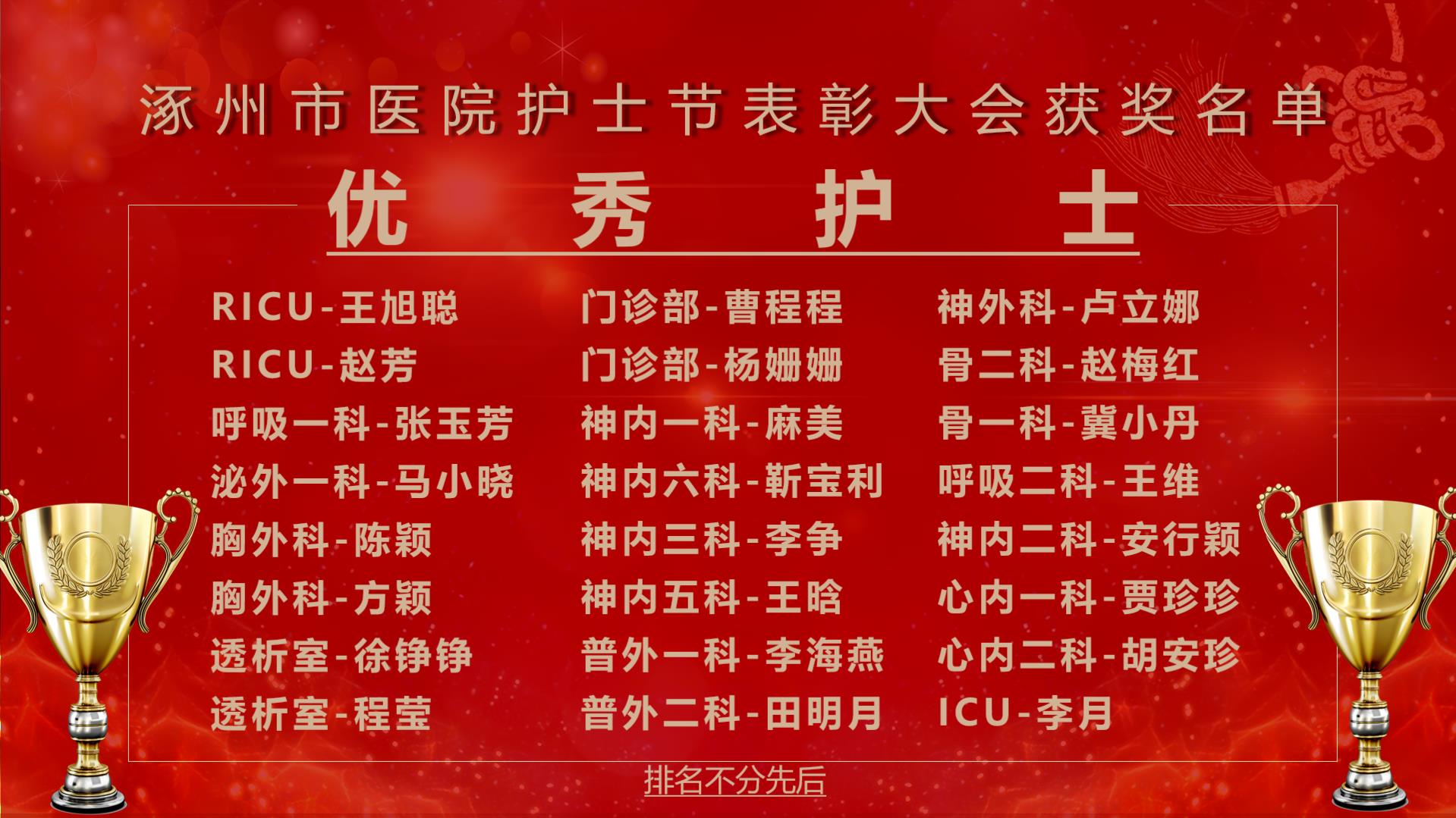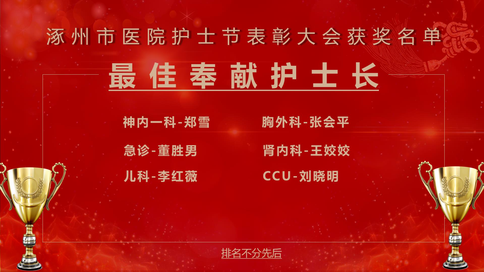 依据护士长绩效考核结果,选出特殊科室排名第一和临床科室排名前四,并且两年内无严重护理不良差错发生,两年内无护理实名投诉的护士长评为优秀护士长,他们分别是: