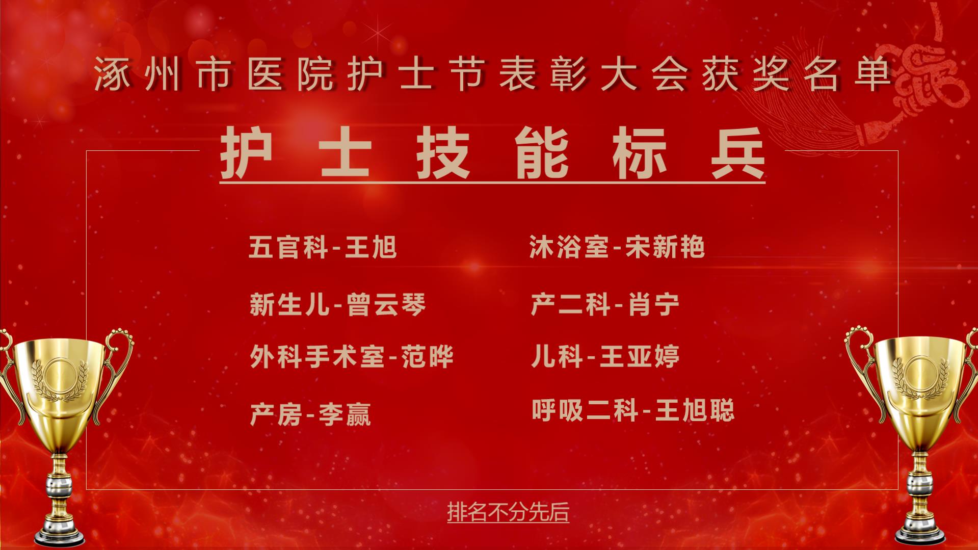日常工作中,操作规范,技术娴熟,专科技术能力强。在科室能够起到模范带头作用。技能岗位大练兵中考核成绩优异的护士被授予技能标兵奖项,他们分别是: