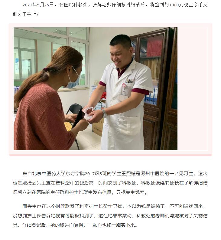 科教处王熙媛学生拾金不昧,1000元现金归还失主
