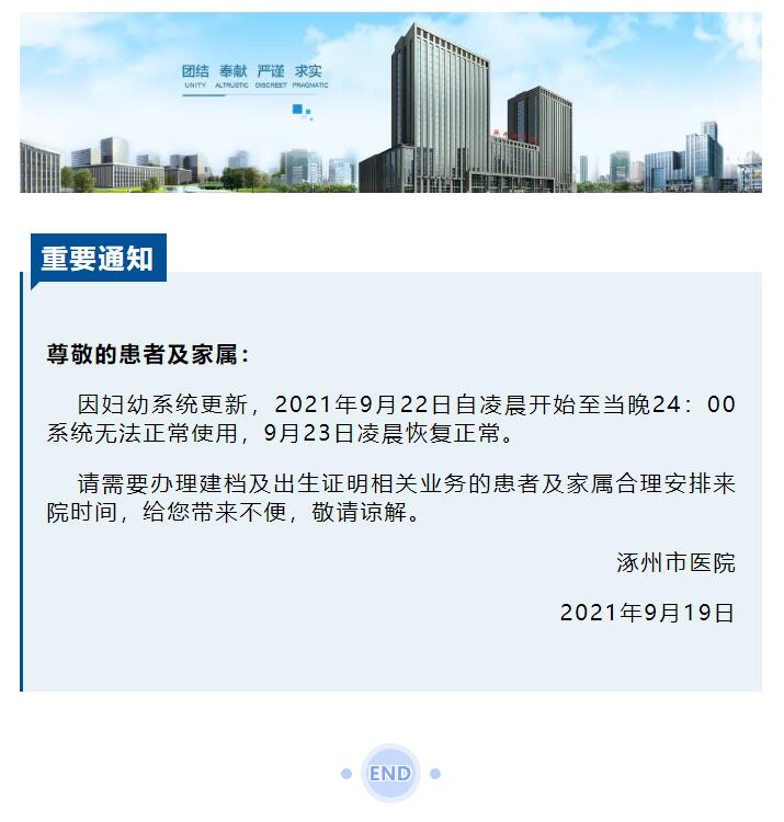 【重要通知】涿州市医院关于9月22日建档、出生证明相关业务暂停办理一天的通知