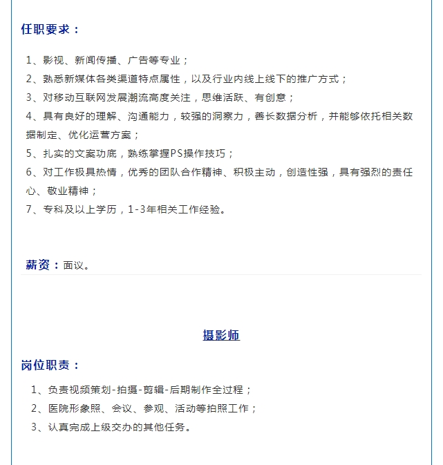 【最新招聘】涿州市医院新媒体运营、摄影师..