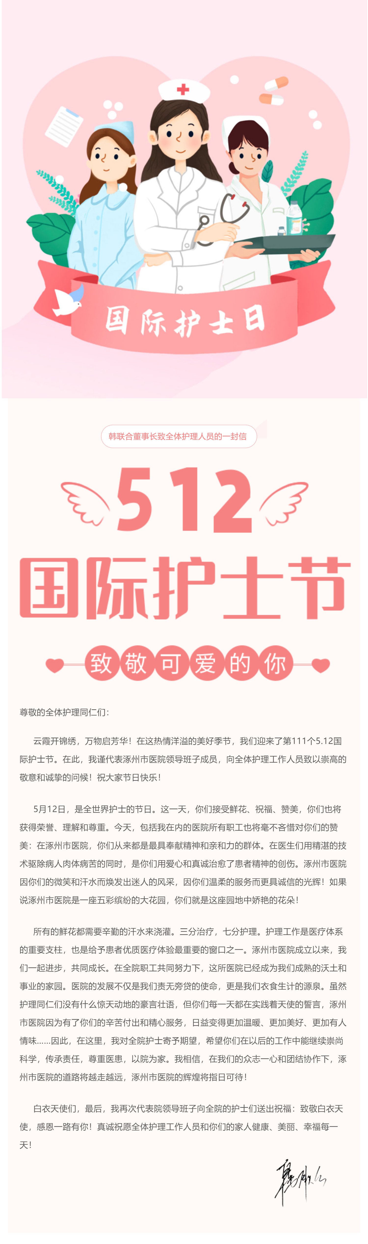 致敬白衣天使 感恩一路有你——韩联合董事长致全体护理人员的一封信