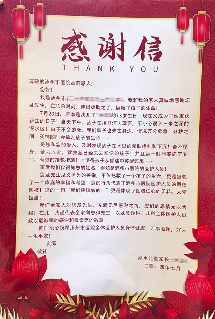 为了表达感激之情,小明的家属为涿州市医院、护理部、儿科医护、高莉护士长送上了锦旗和感谢信,并合影留念。这次救援行动不仅挽救了小明的生命,也挽救了三个家庭。